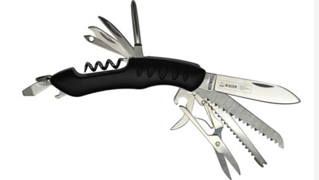 功能:1、開罐器 2、剪刀 3、大刀 4、十字螺絲刀 5、指甲銼(指甲除垢器) 6、螺旋開瓶器 7、開瓶器(一字螺絲刀) 8、匙圈  等